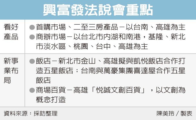 此外,興富發也積極開發飯店及商場百貨,興富發副總廖昭雄指出,「我們在北、中、南都要開飯店,目前金山已和凱悅簽約、台南也要和萬豪集團合作,至於高雄的百貨預計在今年第四季就能夠試營運。」