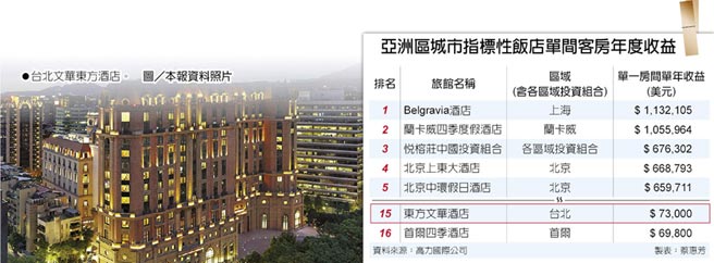 高力國際(Colliers International)昨(26)日最新出爐的「高力國際飯店調查報告書」(Colliers Hotel Insight)指出,台北市符合國際評比的五星級國際觀光飯店,只有文華東方酒店進榜。且根據RevPAR(平均每客房年收益)指標,依交通部觀光局資料採全年住房率100%推估,台北市文華東方酒店RevPAR最高值約7.3萬美元,房價表現和南韓首爾一同敬陪末座,居亞太最後兩名。