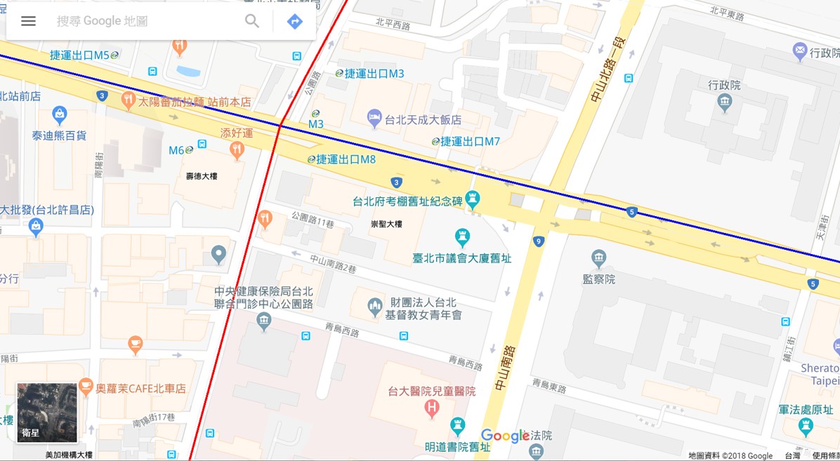 | 地圖中央為台北市議會大廈舊址(圖片來源: Google Map) |