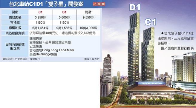 總投資金額達600億元的台北車站特定專用區C1D1土地開發案「台北雙子星」的世紀招標案,台北市政府即將在三月底6度公告招標,各方角力陸續浮上檯面。美國重量級私募基金Bainbridge Investment宣布將揮軍來台,結盟多家美國大咖,計畫攜手美國寶洋集團(Treasure Ocean Group)合組台灣「Taipei Global Partners Group」,參與競標。