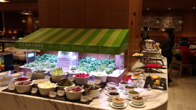其實,整個旭日餐廳沒有「大排場」,意即沒有場地大、餐檯多,而是相對的精緻與具體而微,至於菜餚沒有過鹹過油的狀況,走的是健康清淡的路線(從現場水耕蔬菜的生菜區也可看得出),鹹度則以醬料由客人自行調整。用餐環境清爽舒適,倒是頂符合萬怡的調性。
