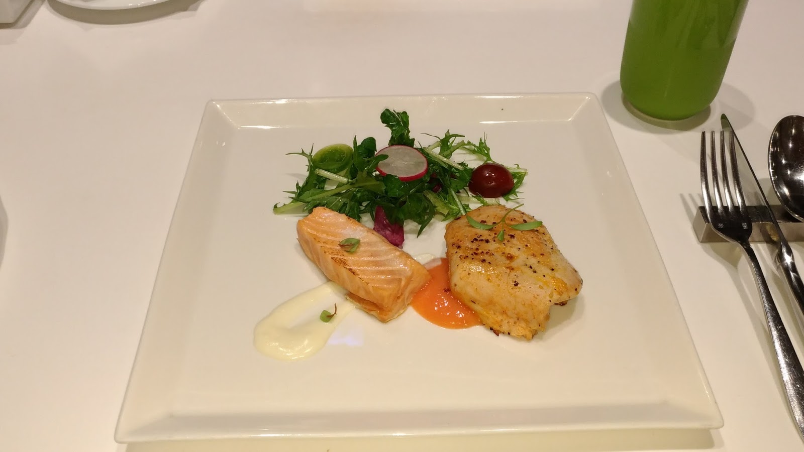| 點的主餐是「低溫火烤生食鮭魚&義大利舒肥嫩雞胸與水耕無毒蔬菜」(中文名字確實落落長 →來個「出水芙蓉(水耕蔬菜)之虞(魚)姬(雞)雙享」好了 XD) |
