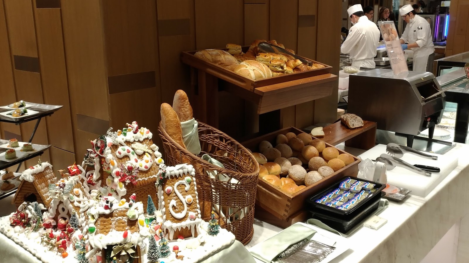 | 中島式餐檯接近門口的是乳酪拼盤(左)與日式小菜(右) (入口處旁另有糖果專櫃區) |
