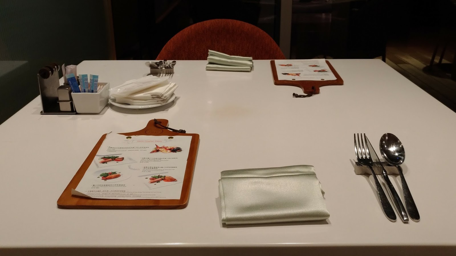 先看看台北六福萬怡酒店的敘日餐廳(Sunrise)。用餐方式是以半自助餐(Semi-buffet)供應(即點一份主餐可再享用沙拉吧餐檯上的餐點),當時是以網路上所購買的優惠晚餐餐券來體驗。(畢竟萬怡酒店在房費以外的消費可是沒有累積會員點數呢!)