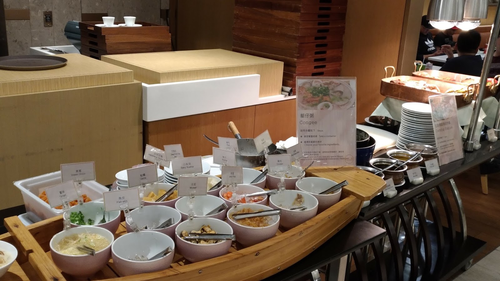 | 右:現切烤牛肉 / 左:艇仔粥(廣式粥品),自己選料,服務人員再添進白粥加熱 |