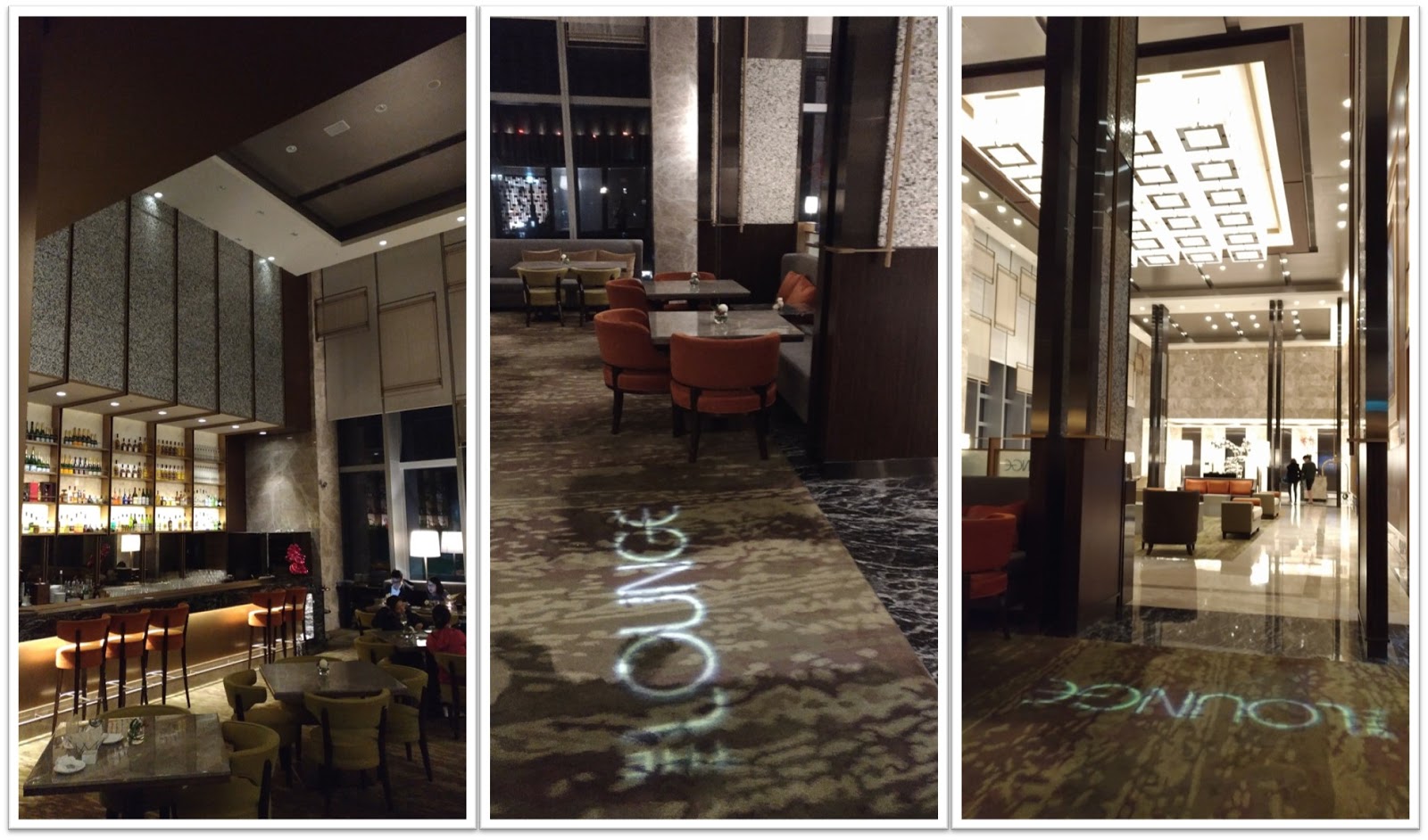 | 左: 吧台區的外觀 / 中: 酒吧入口處的地面投影" The Lounge" / 右: 由酒吧內向酒店大廳望去 |