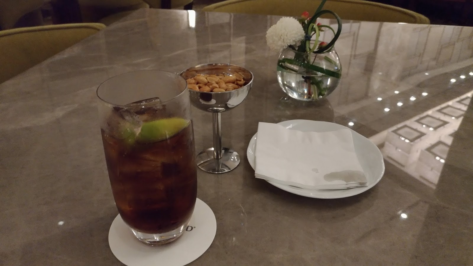 | 用飲料券換的飲品,記得是用威土忌加可樂,附上鹹香的花生 |