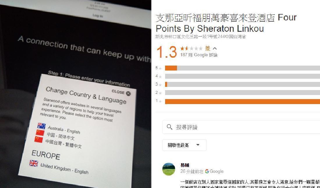 繼航空公司將台灣改名風波後,如今飯店業者也爆國籍爭議。有網友今(9)日在臉書《爆廢公社》貼文表示,林口亞昕福朋喜來登酒店竟將我國國號改為「中國台灣」,還直接掛上五星旗,讓他覺得實在太扯。而其他網友看了也發起集體評論表示抗議,造成該飯店在Google頁面上的評價慘跌只剩1顆星,甚至連名稱也一度被網友惡搞改成「支那亞昕福朋萬豪喜來登酒店」、「中華人民共和國林口特區亞昕福朋喜來登酒店」。