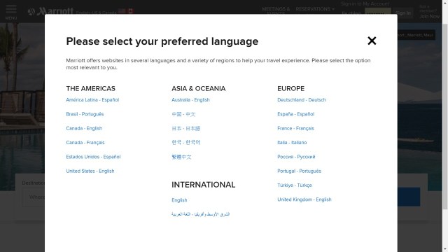 | 萬豪酒店集團官方網站的「語言選擇」未含國家選項(圖片來源:酒店集團官網 ) |