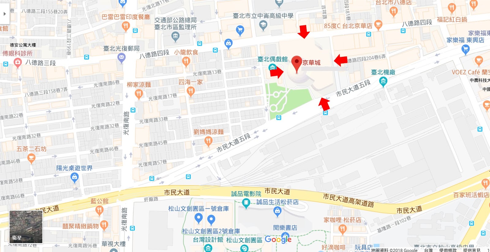 | 京華城購物中心所在位置(如紅箭頭所指地塊) |