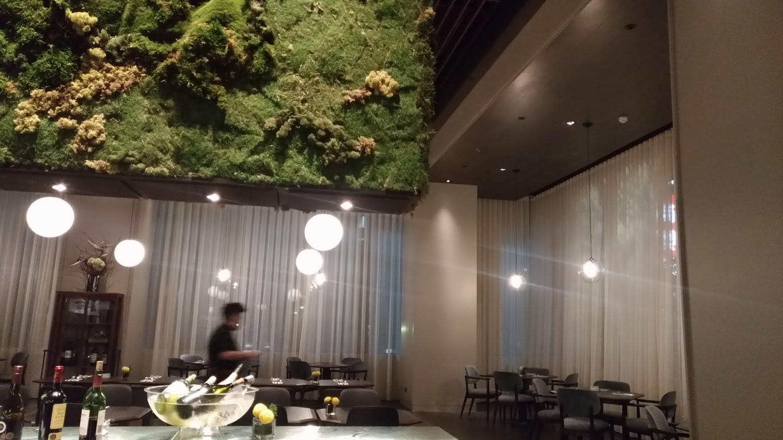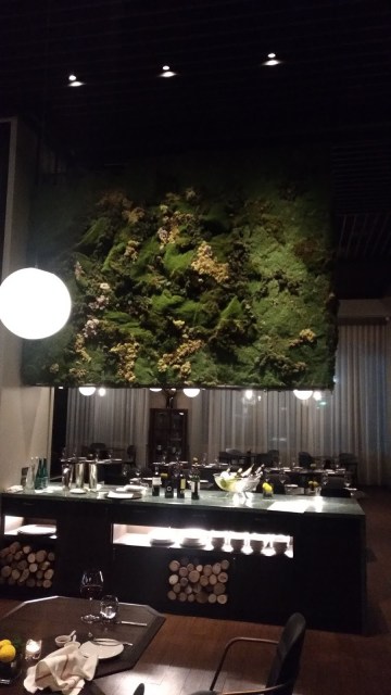 | 「Char 洽」餐廳的中島餐檯與特別的苔蘚裝飾植栽牆 |