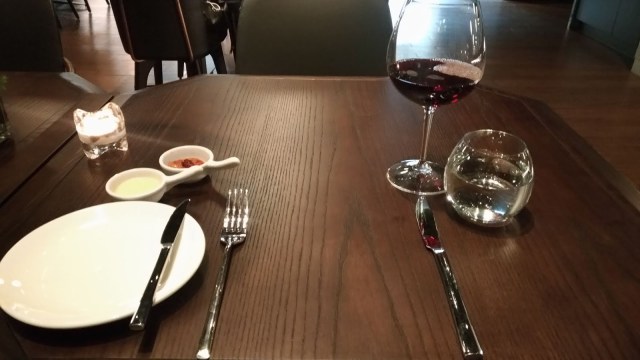 | 餐桌擺設(左前二小碟是黃色的奶油及紅色的義式臘腸醬,右前是佐餐的紅酒) |