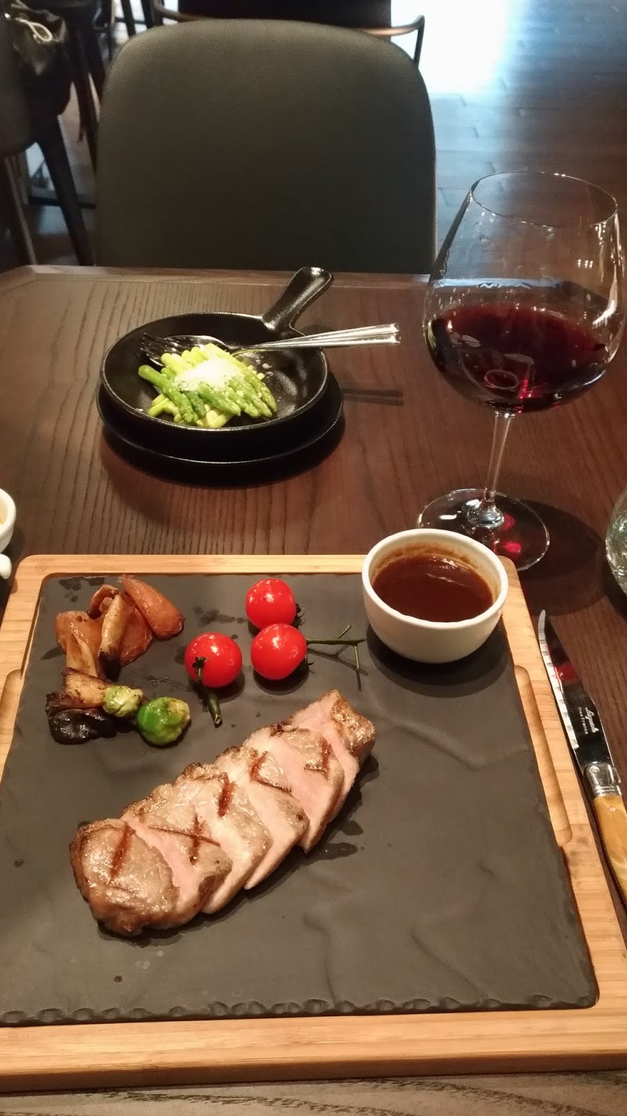 點了伊比利豬佐紅酒醬及蘆筍,全是現點現烤,吃的是食材的自然原味,醬汁及配菜是加點且另外計價(盤中的烤馬鈴薯,蕃茄和球芽甘藍則是原本就有附的),也可以只要求鹽跟胡椒在一旁待命佐料。相較於台式牛排舖天蓋地式的淋醬,雖然一時有點不習慣(沒去過高級牛排館 XD ),但確實是在品嚐食物的味道。(高級豬肉真的沒有任何腥臭味且嫩)至於佐餐紅酒,在服務人員的建議下也是順口不突兀。