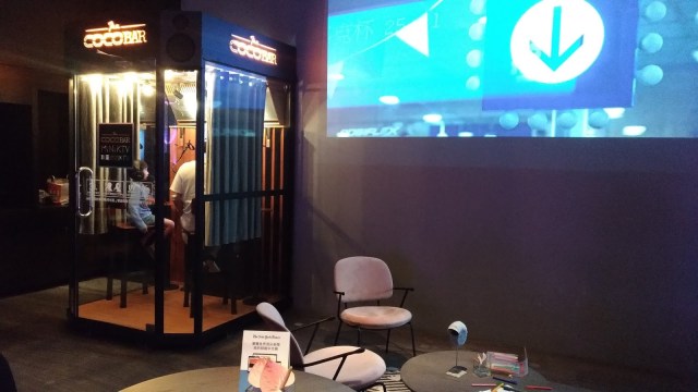 現場除了有以投影式播放的電視節目,還有一個目前流行的自助式KTV包廂(30元台幣可高歌一曲)