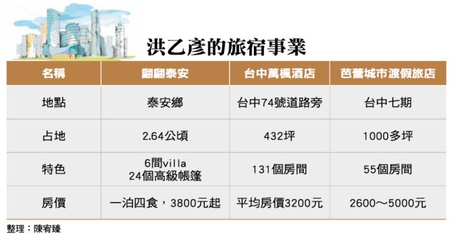 洪乙彥自己「留一手」的土地除了萬楓酒店,還有台中7期1塊1000多坪的土地,兩年前完工,名為「芭蕾城市渡假旅店」,有55個房間,內部是還有游泳池的高級VILLA。此外,在泰安鄉的「翩翩泰安」,則有高級帳棚,內部還可以泡溫泉。