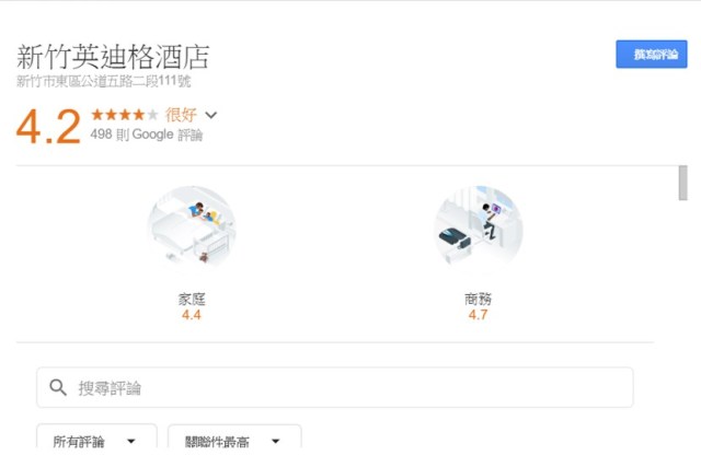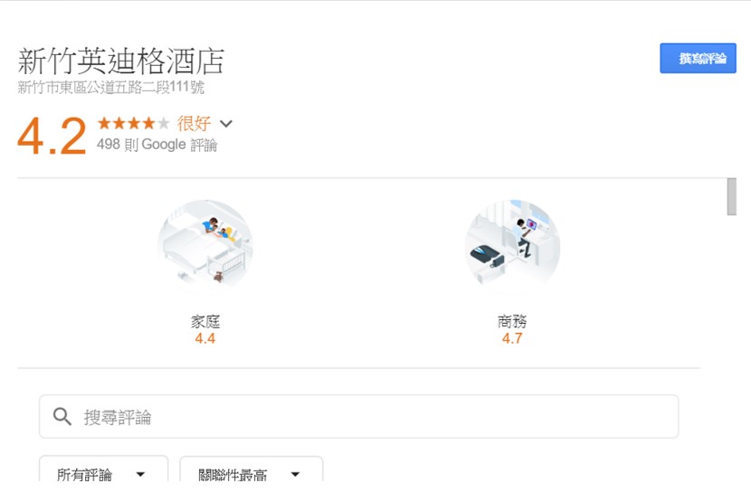 至於Google評論,除了有直接在Google相關服務上的評論外,其實也兼及線上訂房平台(如AGODA、Booking.com等)及「貓途鷹評論網(TripAdvisor)」的部份,498則評論以分眾評比來看,家庭客源的分數為4.4分,商務客源的分數是4.7分均為相當高分的分數。