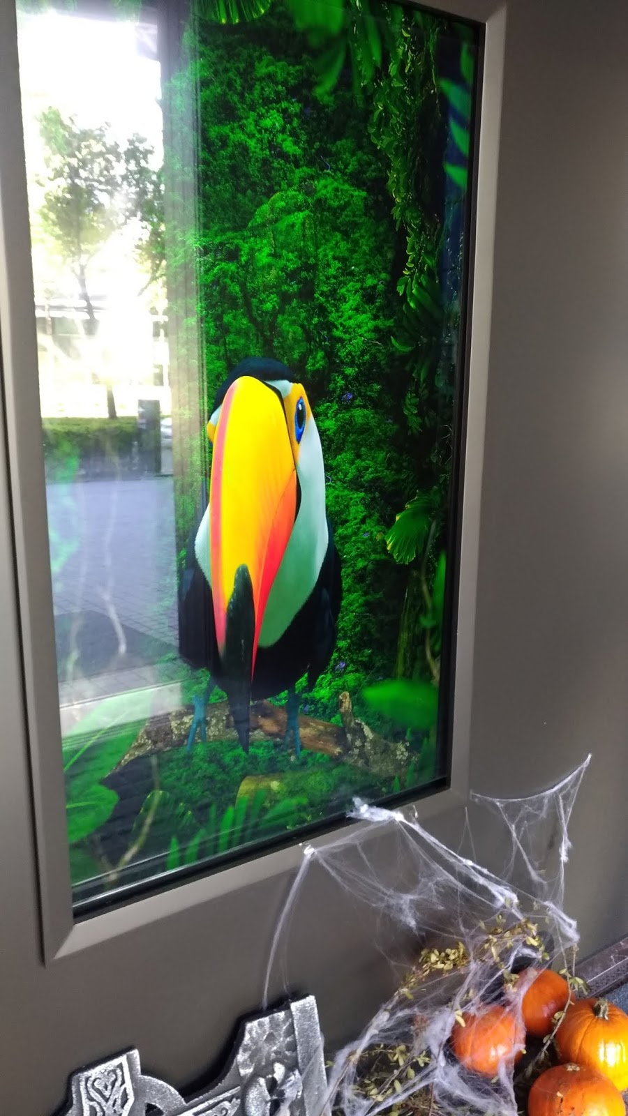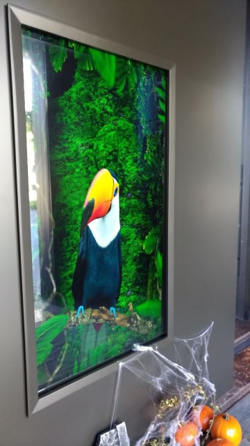 白天的迎賓螢幕則播放互動式巨嘴鳥