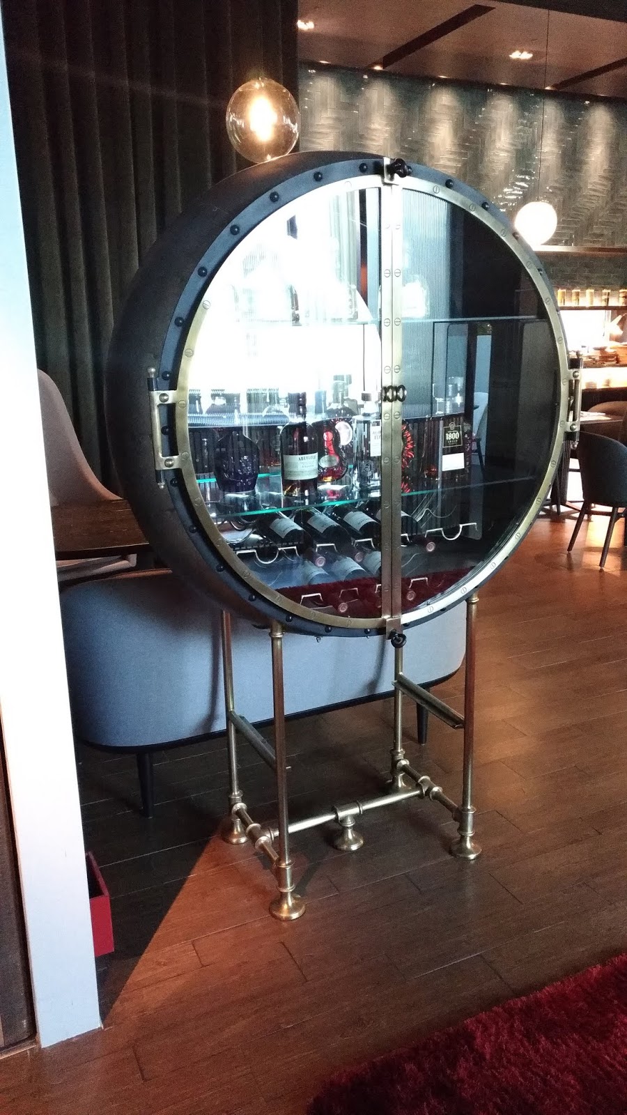 位於「Char洽」餐廳門口,像船艙窗戶的酒櫃