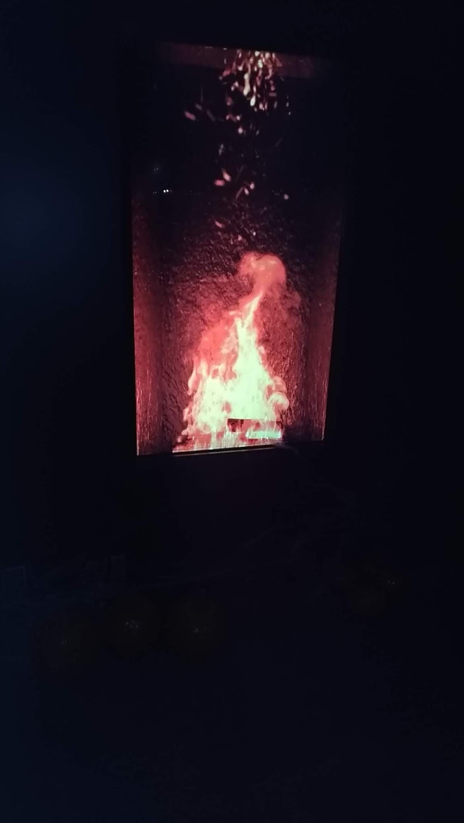 晚上的迎賓螢幕播放著逼真的壁爐火