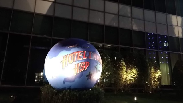 晚上的大門外觀(正中央是迎賓螢幕),燈光營造的氛圍有種高級夜店之感