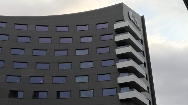 | 酒店建築體的側面上方有自家的標誌(logo) |