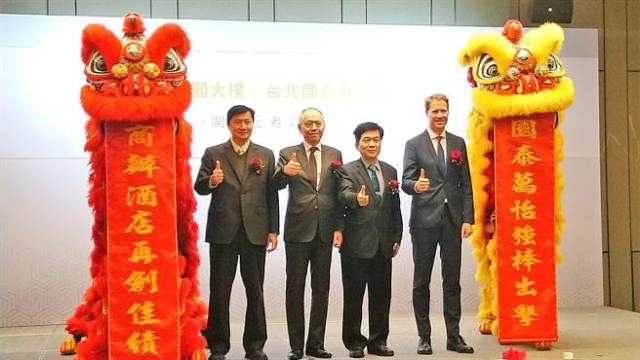台北國泰萬怡酒店11日正式開幕,右1為萬豪國際集團港、澳、台及海南地區區域副總裁夏浩勤(Jakob Helgen)。(林資傑攝)