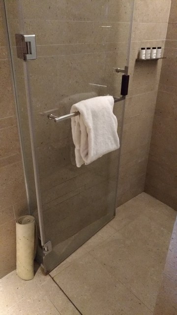 後來筆者因行程提前完成,早了一些時間返回而房間也呈現整理過的狀態(但水漬還在),去電提醒服務人員檢修,先後來了房務人員與工程部門人員。一開始房務人員查看蓮蓬頭架後除了頻頻道歉外,讓筆者誤以為是「問題會擱置到隔天退房後才處理」,後來筆者再表示希望今天下午維修完成,這位看似「被派來當炮灰」的房務人員才退出房間與工程部人員聯繫處理。工程部人員查看之後,與房務人員「低調討論」了不到一分鐘,改推派工程人員與筆者溝通,表示因支架的橡膠墊片磨損加上零件所在部位需要較大範圍裝卸,耗時需20~30分鐘,會比較「久一些」,筆者再「軟中帶硬」地回應10分鐘後可以再外出 (筆者提早至3樓的喜來登俱樂部「看看」)讓工程人員處理。二度回房後,水漬與淋浴桿的部份已處理完畢。