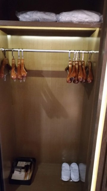 | 衣櫃右半,上: 被折疊包裝的浴袍 / 左下: 洗衣袋、洗衣單、擦鞋盒組 / 右下: 室內拖鞋 |
