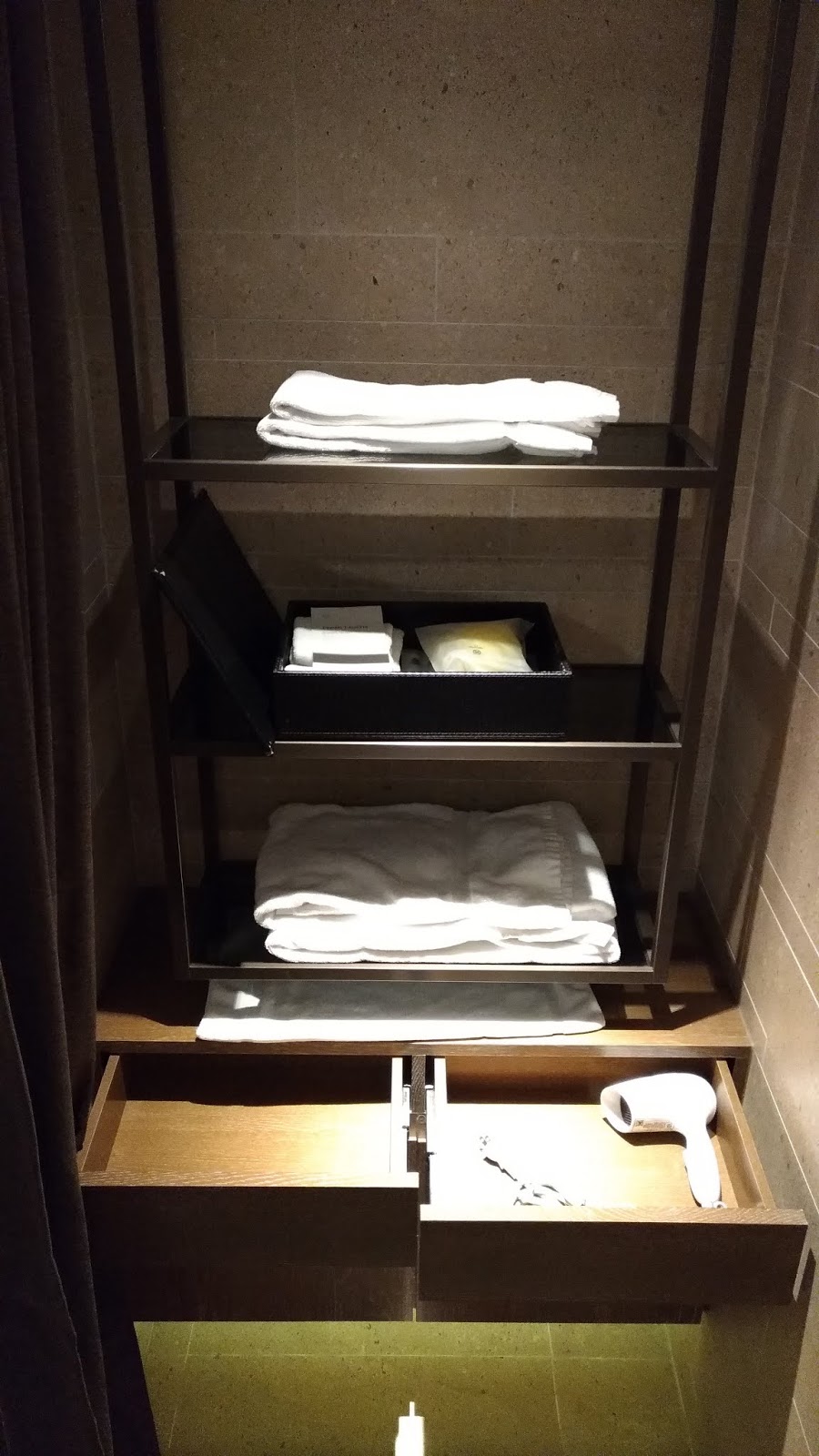 | 衣櫃右半,上: 被折疊包裝的浴袍 / 左下: 洗衣袋、洗衣單、擦鞋盒組 / 右下: 室內拖鞋 |