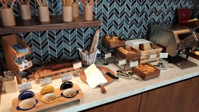 | 早餐時段所提供的麵包品項,除了吐司、法國麵包、小可頌、小丹麥麵包外,亦有萬楓品牌所傳承的布朗尼蛋糕(左後的木盤上),而圖中央的小貝果有嚼勁、好吃 |