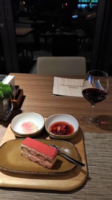 這甜點一上桌,頓時有種應該要少女心噴發的感覺,或是Hello Kitty主題餐廳的Fu(因為很粉紅,旁邊還擺了一杯「紅」酒),雖然尷尬了一,二秒,但甜點仍要品嚐。