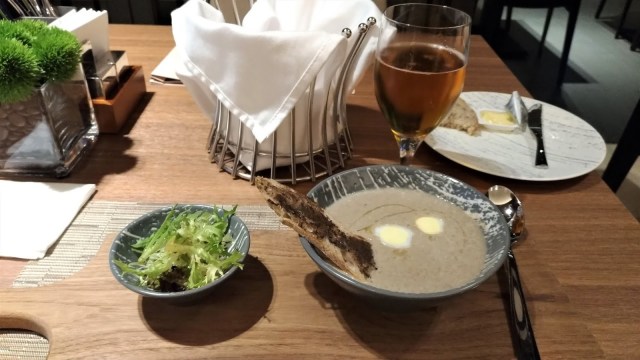 由於住宿第二天下午借用餐廳一隅進行訪談,於是晚餐在館內消費比較不「歹勢」(笑),一種補償的概念,當然也嚐嚐味道如何。餐點以前湯(另有麵包)、中主菜、後甜點的型式,期間搭配啤酒與單杯紅酒。