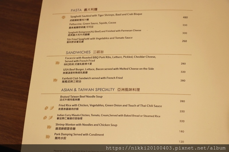 | 菜單的「義大利麵 / 三明治 / 亞洲風味料理」頁面 (圖片來源: 部落格 ) |