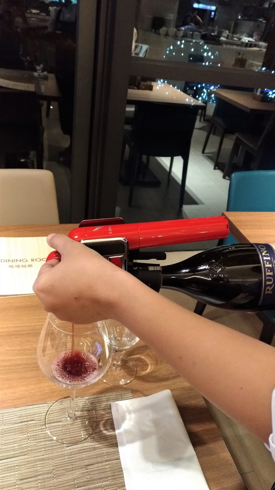 上方圖中的紅色「傢俬(台語)」即卡拉文取酒器,服務人員特別提到全台第一間採用卡拉文取酒器的酒店就是台中萬楓酒店,這個取酒器的奧妙之處在於可以藏於民居之中,隨手可得,還可以坐著它來掩藏…(→派屈克,你很煩耶,那是折凳啦!厚! XD )以「取酒針」穿刺過酒瓶的軟木塞,再注入高純度氬氣將酒推擠出來。取酒完後,把取酒針抽出,軟木塞便會因其天然彈性而癒合。整個過程沒有氧氣進入瓶中,剩餘的葡萄酒仍可繼續保存及熟成。(要注意的是,該取酒器僅限使用於無氣的葡萄酒,意即氣泡酒與香檳不適用)