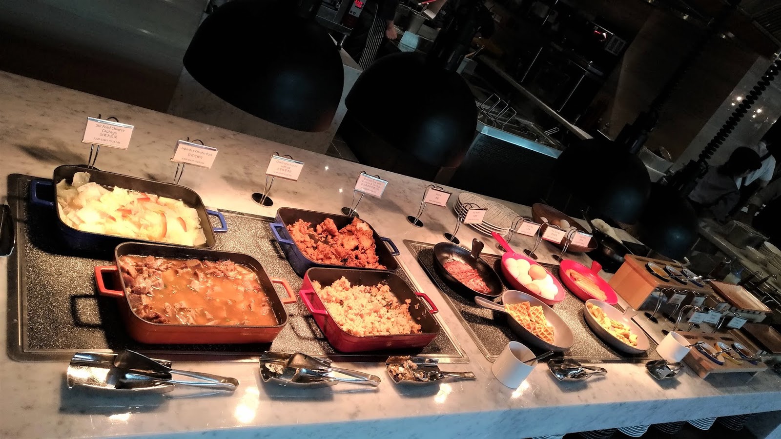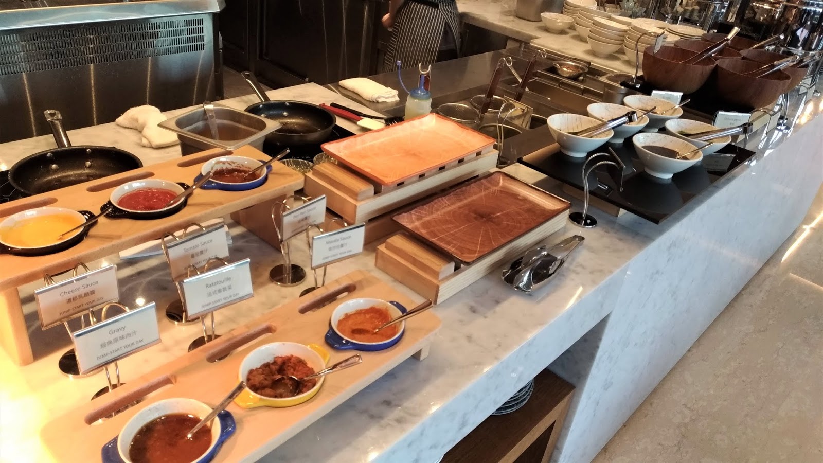 | 現作蛋料理區,而左方有6種餐廳自製醬料可搭配蛋料理或其他菜餚: (由左上至右下)濃縮乳酪醬、蕃茄醬汁、(?)、經典原味肉汁、法式燉蔬菜醬、馬沙拉醬(印度綜合香料醬);右方為現煮麵點區 |