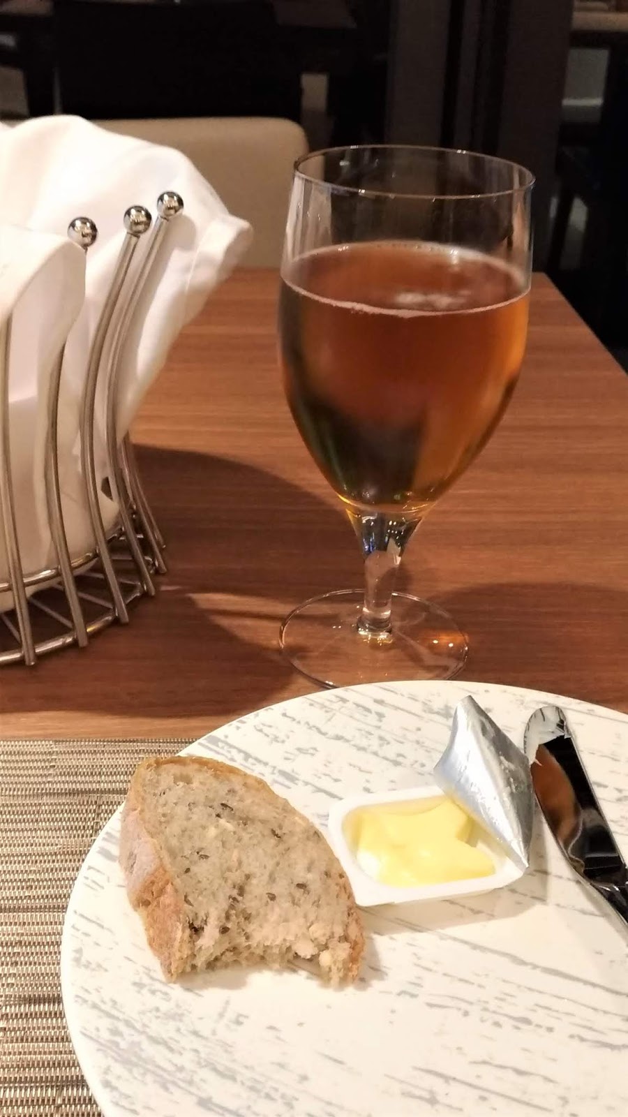 由於住宿第二天下午借用餐廳一隅進行訪談,於是晚餐在館內消費比較不「歹勢」(笑),一種補償的概念,當然也嚐嚐味道如何。餐點以前湯(另有麵包)、中主菜、後甜點的型式,期間搭配啤酒與單杯紅酒。