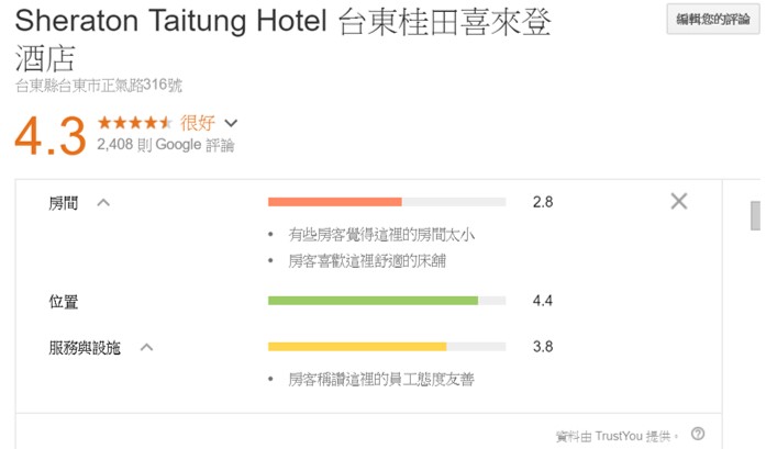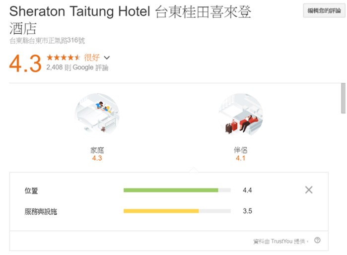 若再仔細分析家庭客群的反饋,「客房」部份僅有2.8分,應與房間實際使用坪數與動線流暢程度有關,「位置」則因位於台東市中心,前往各景點的交通便捷而有4.4分,至於「服務與設施」部份則是3.8分。