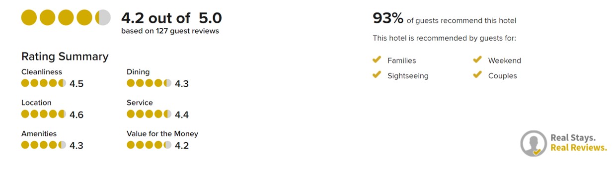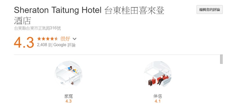 至於在谷歌評論的部份則總計有2408則,其中4分以上的佔比有86% (2071則),未達4分者則是14%(337則);另外,谷歌評論中有特別挑出評論族群最多者為「家庭客群」與「情(伴)侶客群」,前者評分為4.3分,後者是4.1分。需了解的是,谷歌評論雖有兼及其他訂房與旅遊評論網站的評比,但因無門檻與限制之故,有時會發生偏頗的狀況。