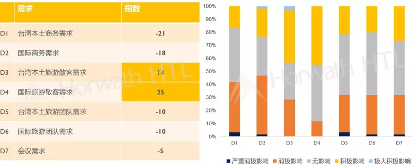 研究中我們發現,從業者大多對旅遊業發展以外的因素抱有比較消極的態度,特別是對於國際政局的動盪和全球經濟情勢所帶來的影響都表現出擔憂。各項指標中唯一的正向因素是台灣旅遊業的發展,這主要歸功於近年來台灣當局重點打造「體驗觀光」。此外,台灣觀光局開拓海外市場的策略也開始看到成效。我們也相信台灣旅遊的逐漸復甦會為酒店業注入新的動力。另外一個值得期待的地方在於即將到來的2020年選舉,可望為諸多負面影響的因素帶來轉機。