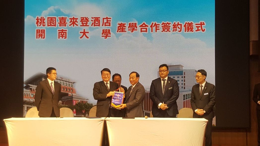 | 桃園喜來登酒店開幕當天同時舉行與開南大學的產學合作簽約儀式,開南大學校長梁榮輝前排左)致贈校旗與禮物予董事長李三連(前排右) 劉立諭/攝影 |