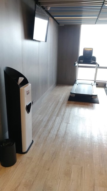 | 健身房設備一隅 01 (左: 抽取式清潔紙巾與垃圾桶;右: 跑步機) |