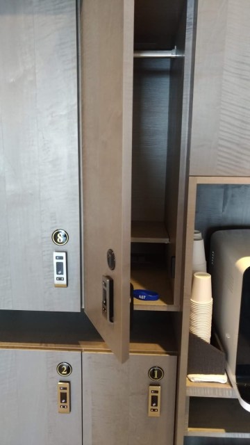 | 置物櫃示意圖(採用感應手環的方式開鎖,右為附設的飲水機) |