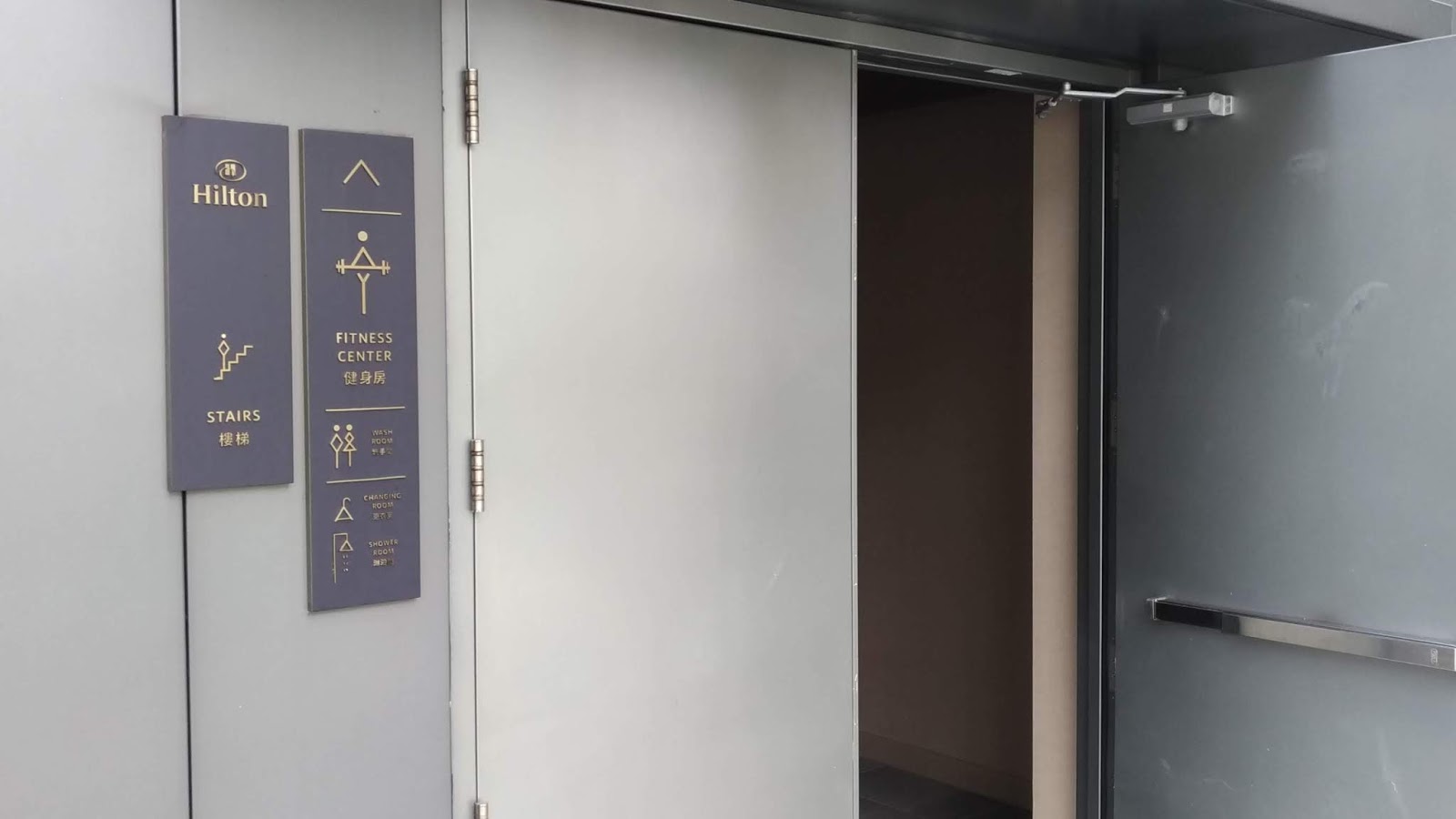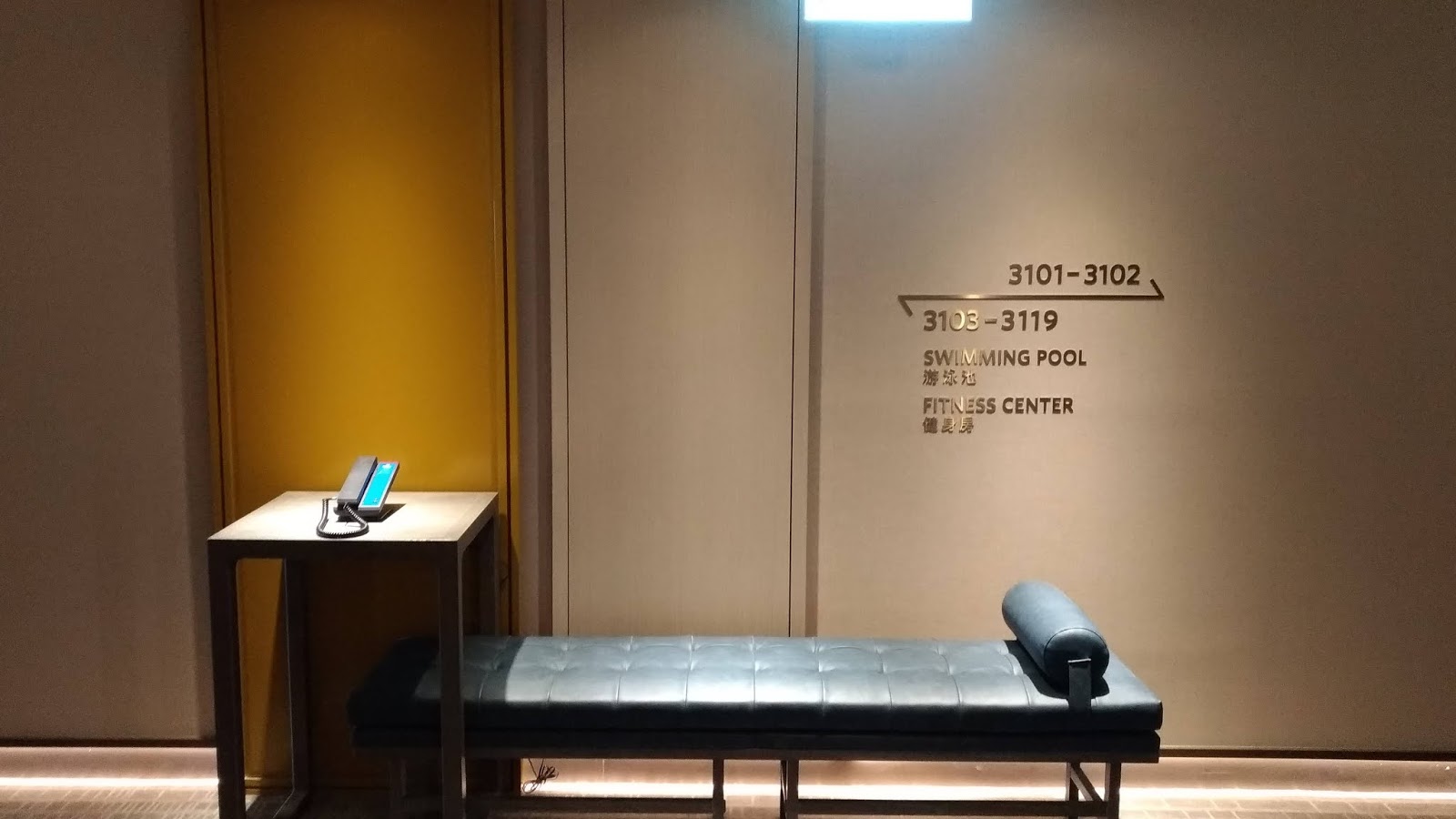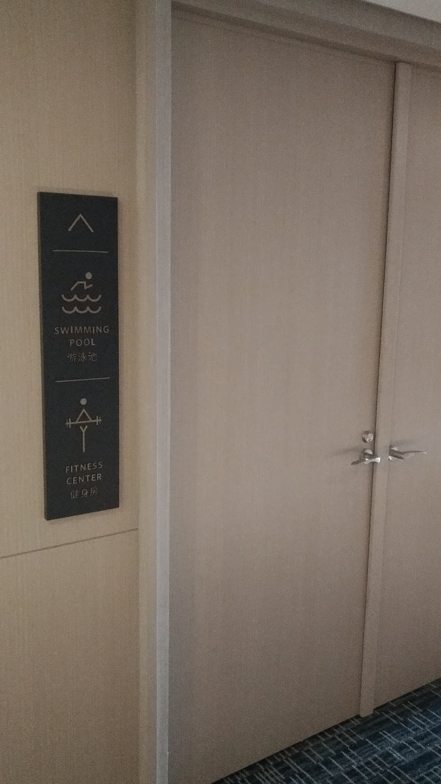 | 大部份前往頂樓健身房與泳池都是經由31樓的樓梯走上去(因為5台電梯只到31樓。圖為31樓的牆面指引) |