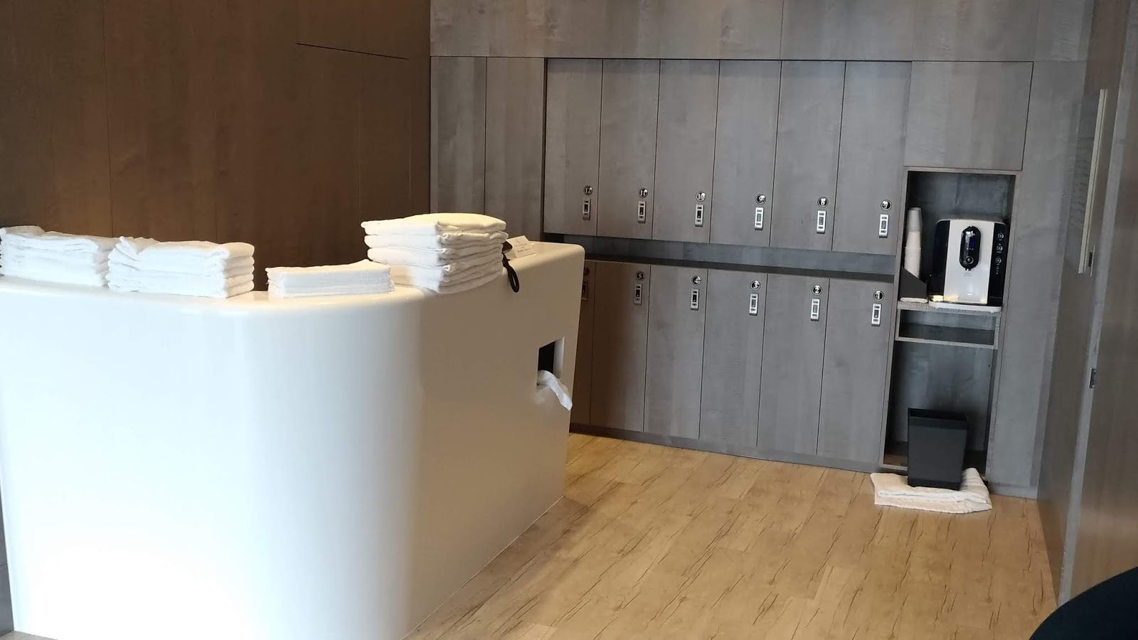 | 由於採自助式服務,櫃檯大部份時間無專人服務(檯面上為中毛巾與大毛巾),但有專線可尋求協助或直接請凱撒飯店的服務人員幫忙,比方使用置物櫃(圖右半所示) |