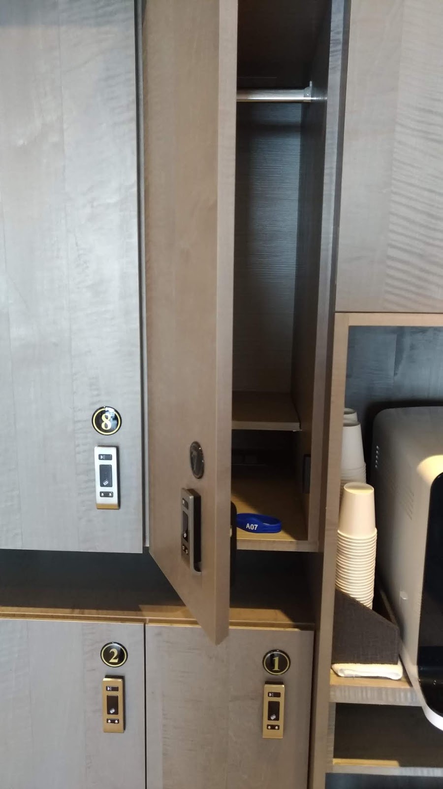 | 置物櫃示意圖(採用感應手環的方式開鎖,右為附設的飲水機) |