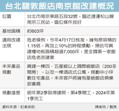 全國飯店危老第一案,屋齡41歲的台北馥敦飯店南京館改建計畫啟動;大陸建設昨(2)日公告與台北馥敦飯店南京館簽訂合建契約,預計明年第2季取得建照,2024年首季完工後將化身成為國際五星級飯店、酒店式公寓。