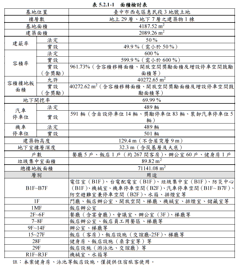 該案為包含飯店棟及住宅棟等2個主要建物的複合式建築,其中飯店部分預定興建樓層為地上21樓、地下4樓,客房數約260間,餐廳部分包含:日本料理、全日餐廳、中式料理、空中酒吧等,另外也設有宴會廳、會議室、游泳池、健身房及大浴場等設施。