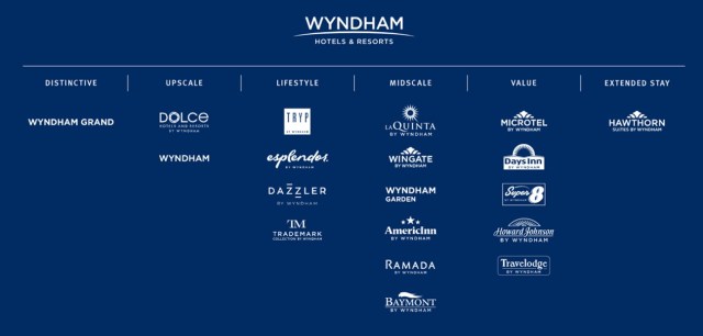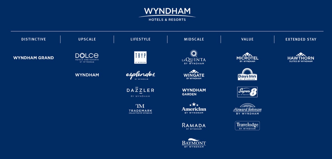 溫德姆酒店集團旗下酒店品牌包括有:包括速8酒店(Super 8 by Wyndham)、戴斯酒店(Days Inn by Wyndham)、華美達酒店(Ramada by Wyndham)、華美達安可酒店(Ramada Encore by Wyndham)、麥客達溫德姆酒店(Microtel Inn & Suites by Wyndham)、La Quinta、蔚景溫德姆酒店(Wingate by Wyndham)、AmericInn by Wyndham、Hawthorn Suites by Wyndham、Trademark Collection by Wyndham和溫德姆酒店及度假酒店(Wyndham),在經濟型酒店和中高端旅宿酒店市場市占率很高,且以授權加盟發展為主要布局策略,頗能迎合台灣旅館飯店市場現況需要。
