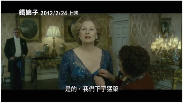 | 「是的,我們下了猛藥,但這是病人所需要的。(Yes, the medicine is harsh, but the patient requires it.)」(截圖來源:電影【鐵娘子:堅固柔情】預告片) |