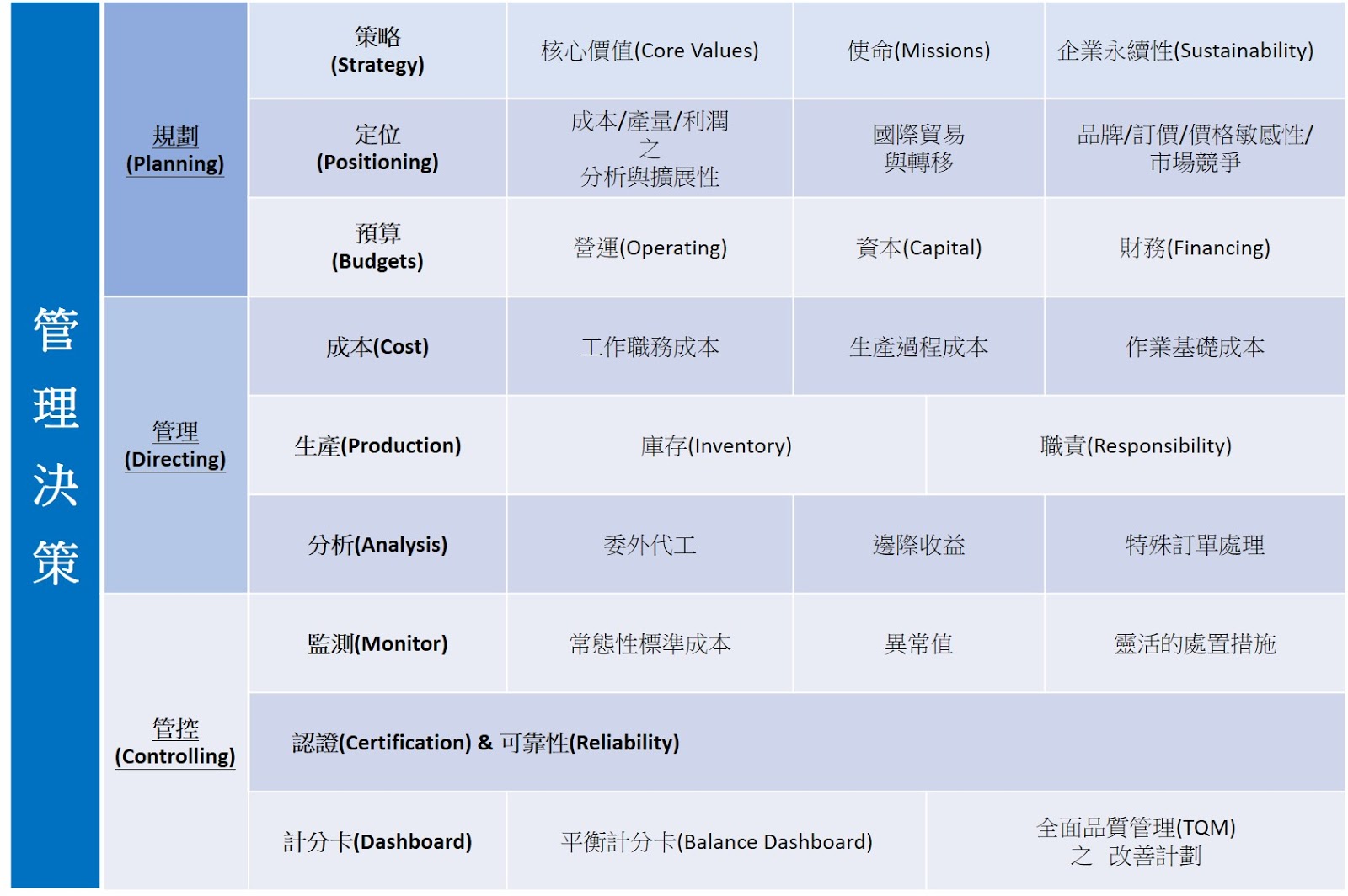 *「管理會計」是應用會計學收集得來的之企業數據及報表,給予公司內部管理人參考和監控企業活動及適時作出決策及修訂等。(摘錄自《管理會計》第三版,指南書局)